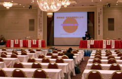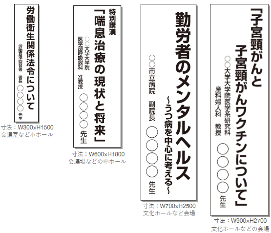 横断幕は舞台中央上部に取り付けるメインタイトルになります。演題や大会名などが入る横断幕は催事には最低限欠かせない物です。